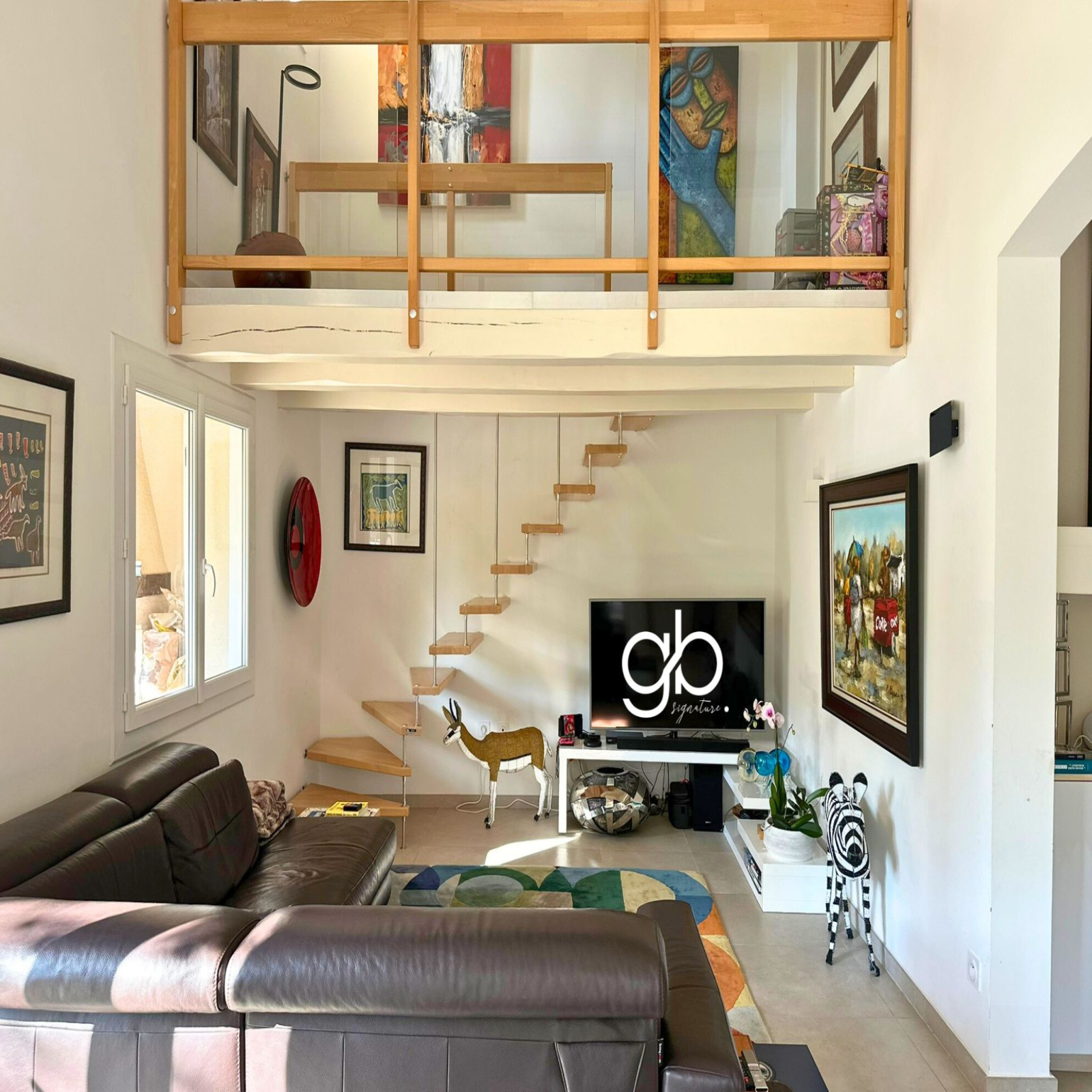 À l’étage, accessible par un escalier en bois, une mezzanine lumineuse dessert une chambre (ou bureau) et une salle de douche avec WC.
