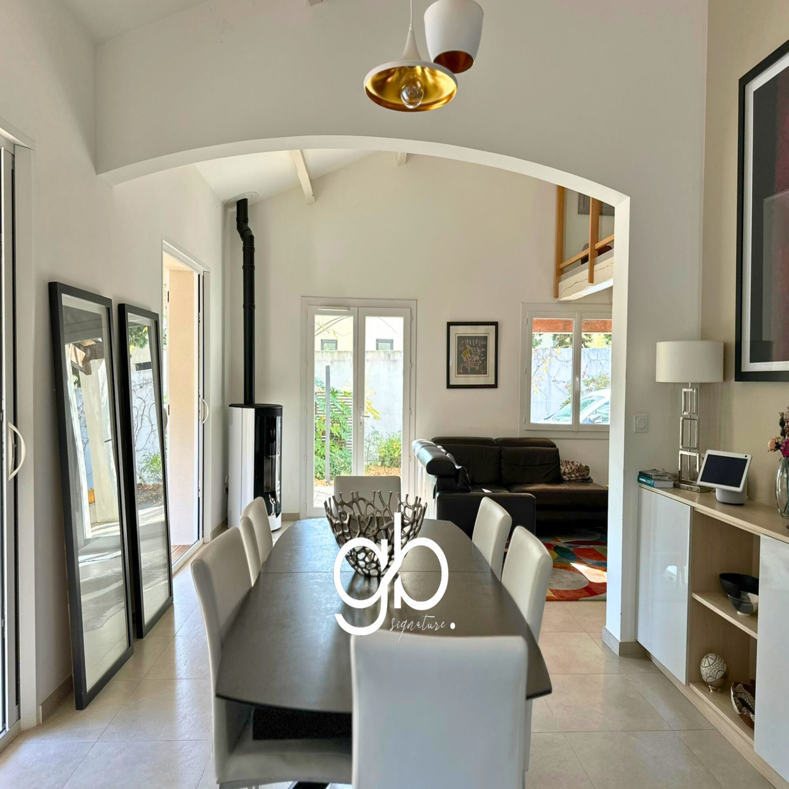 L’entrée mène sur une buanderie fonctionnelle et une grande pièce de rangement. L’espace de vie se compose d’une cuisine moderne entièrement équipée ouverte sur un salon-séjour cathédrale. Les grandes baies vitrées assurent une belle luminosité et une continuité naturelle avec la terrasse et le jardin.