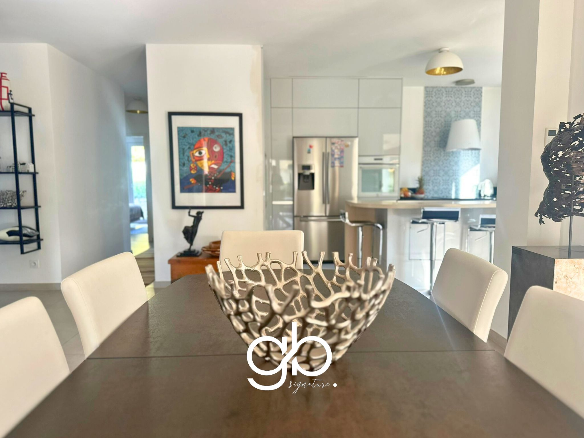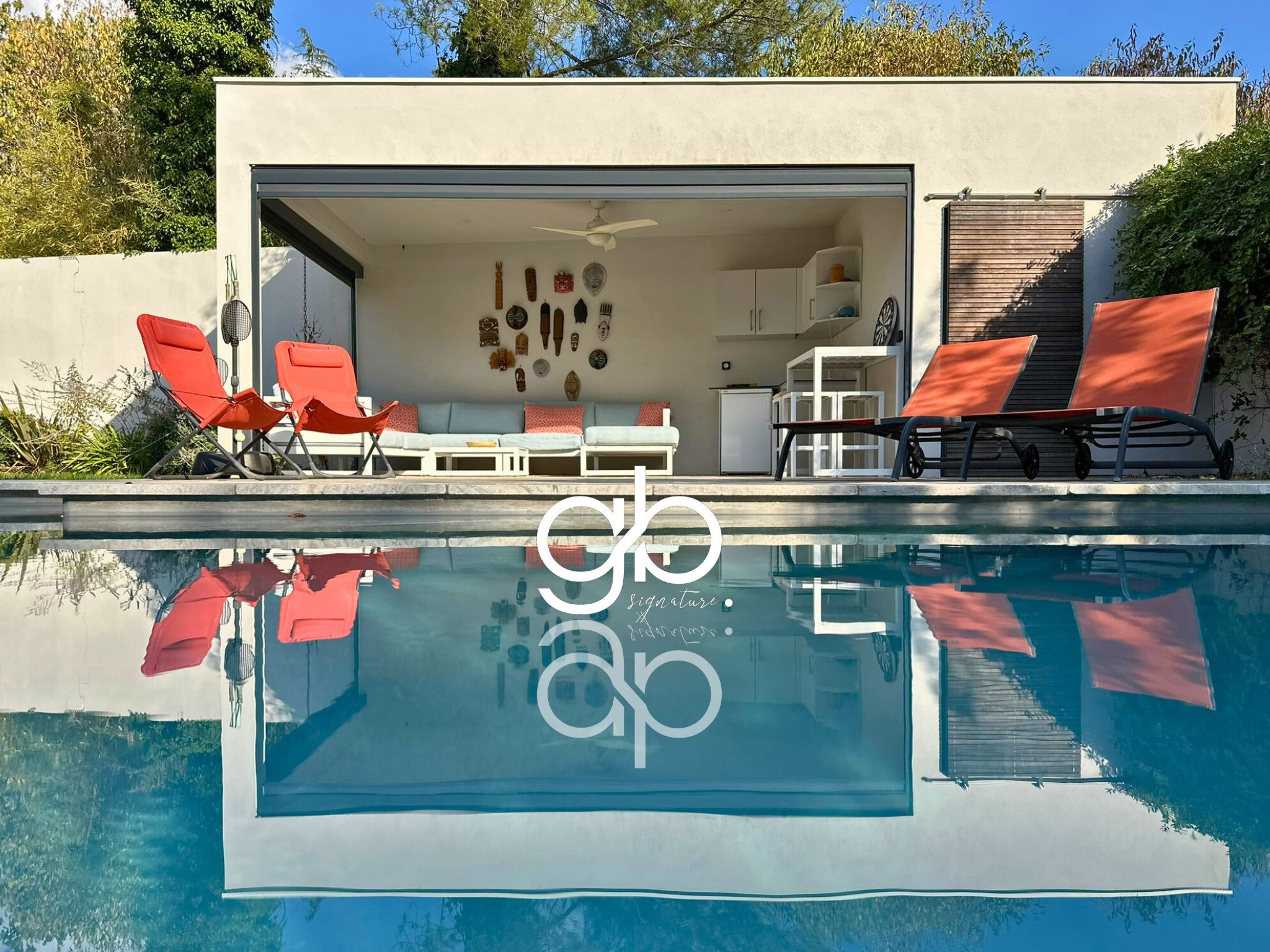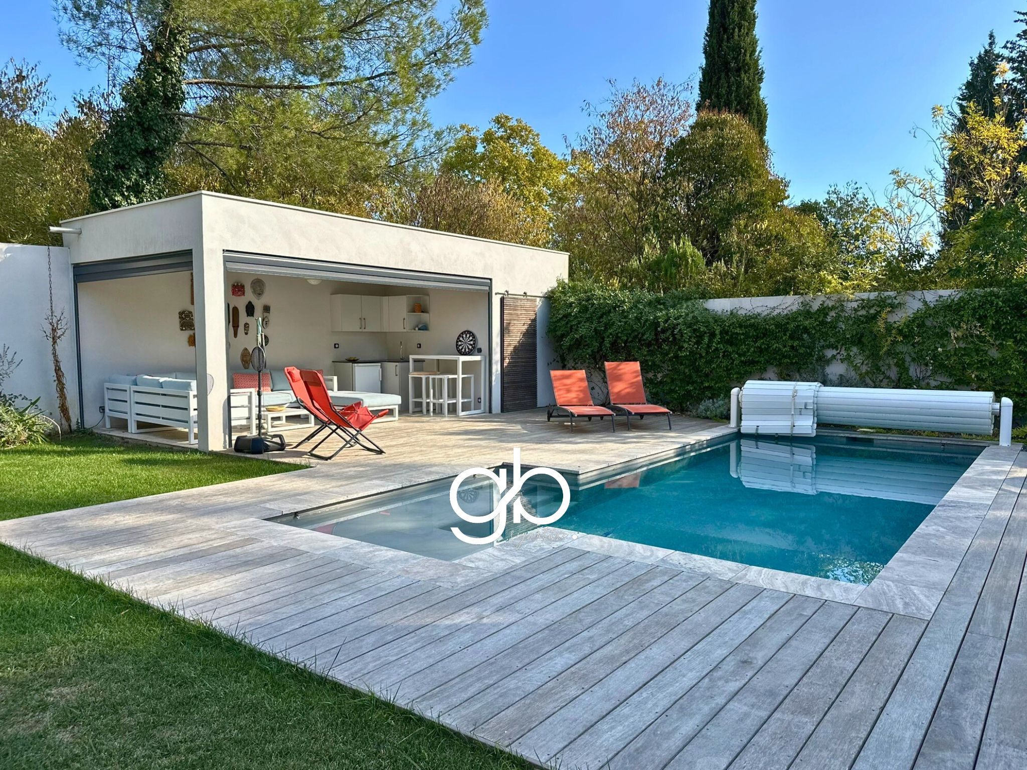 À l’extérieur, un jardin paysagé et sans vis-à-vis abrite une piscine à débordement équipée d’un volet roulant immergé, un bassin à poissons, une douche extérieure, un coin barbecue et un pool-house aménagé avec espace détente et cuisine d’été. Le tout dans une ambiance paisible et végétale.