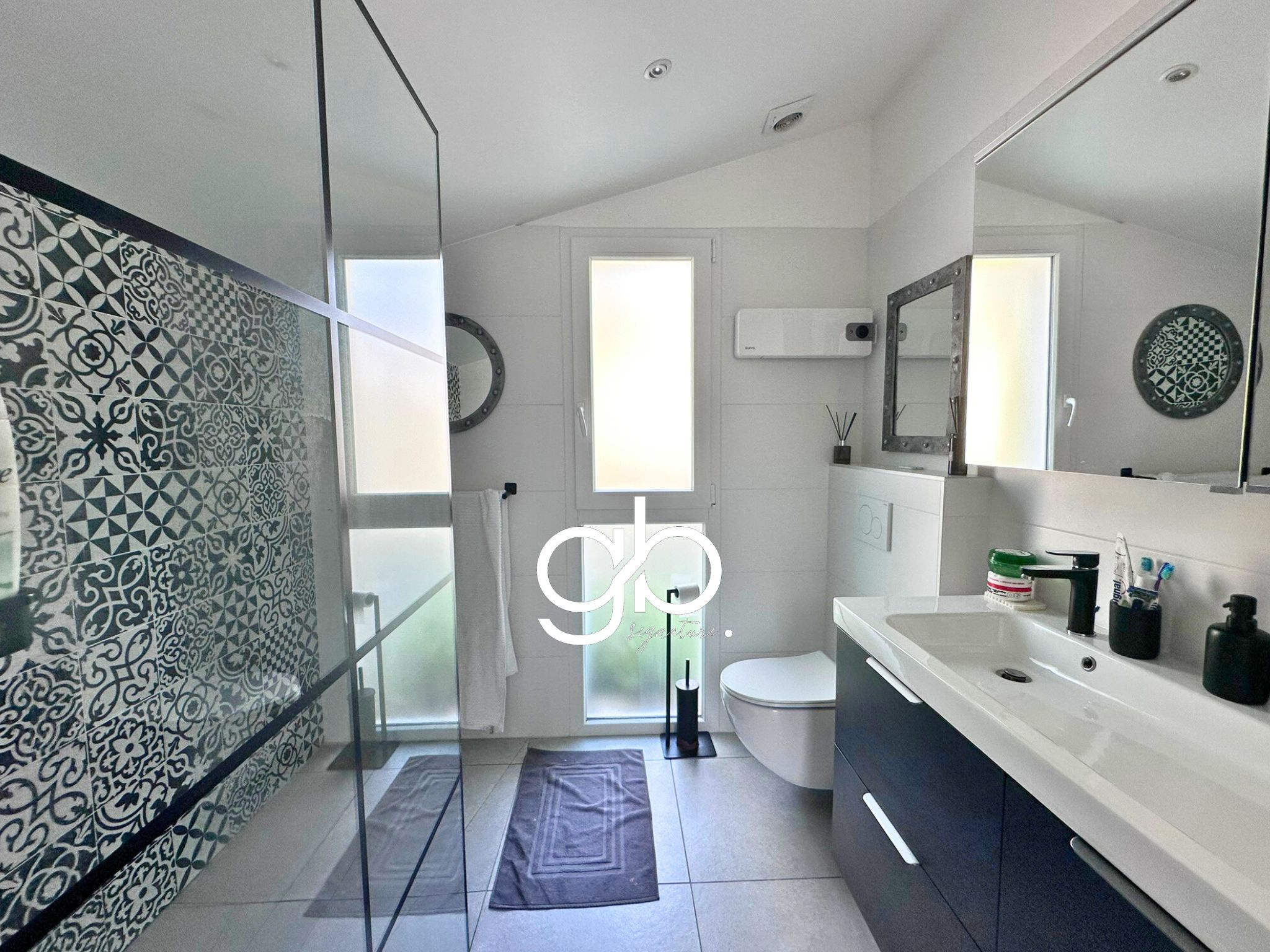Le rez-de-chaussée accueille une suite parentale avec dressing et salle d’eau double vasque, deux chambres supplémentaires, une salle de bain avec baignoire et douche, ainsi qu’un WC indépendant.