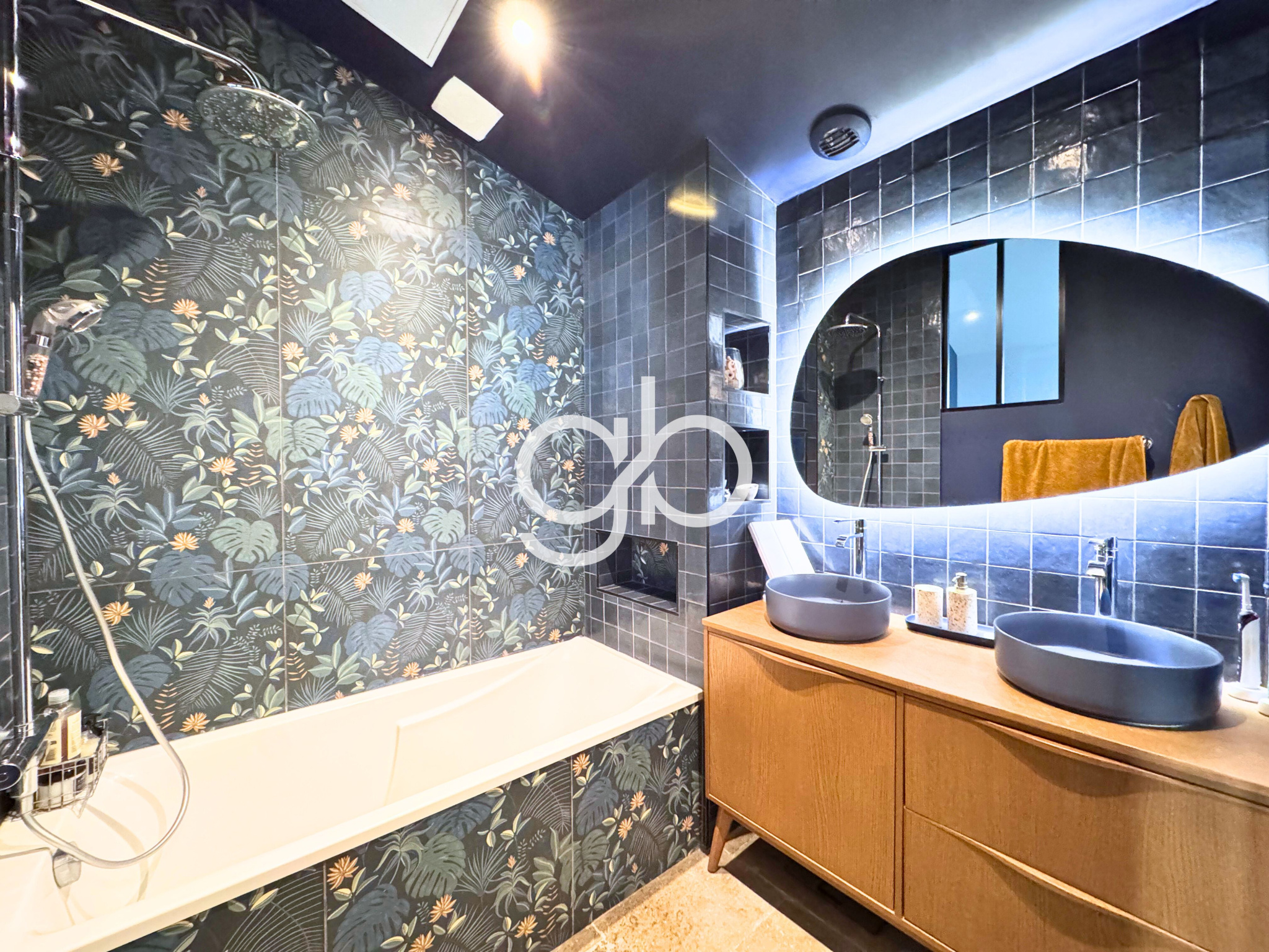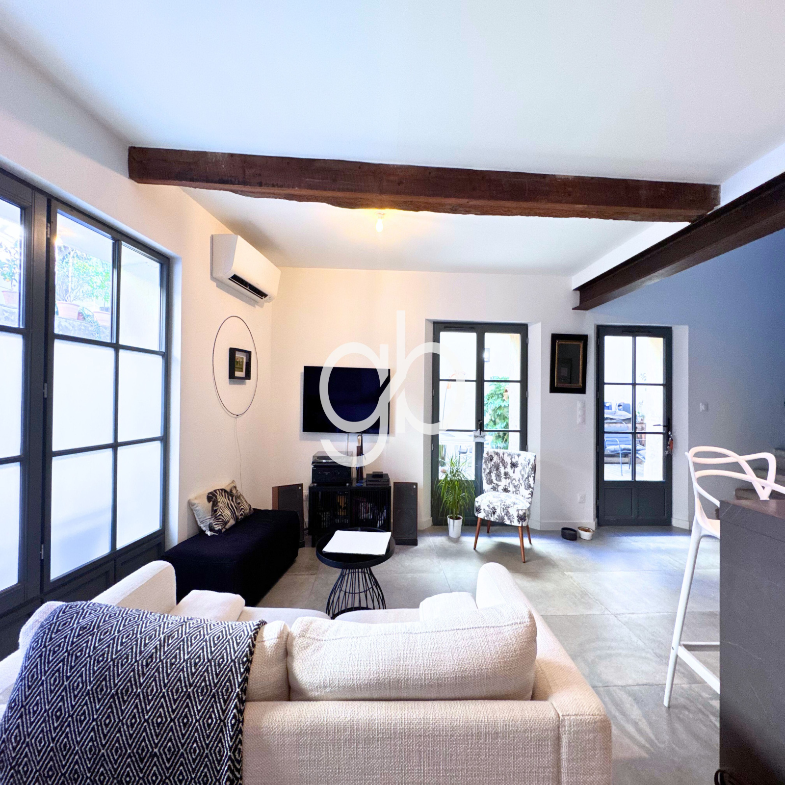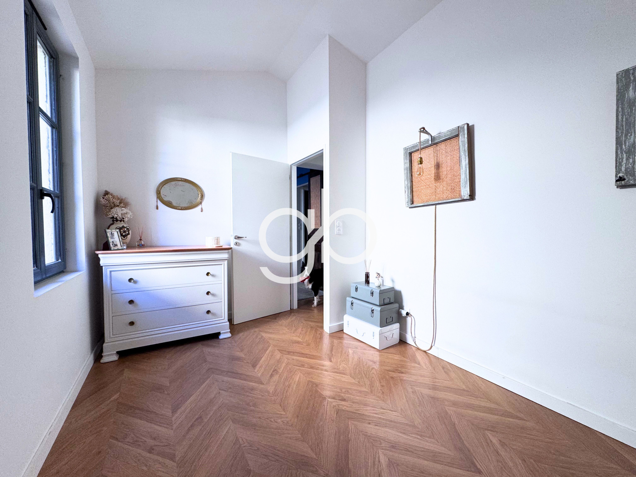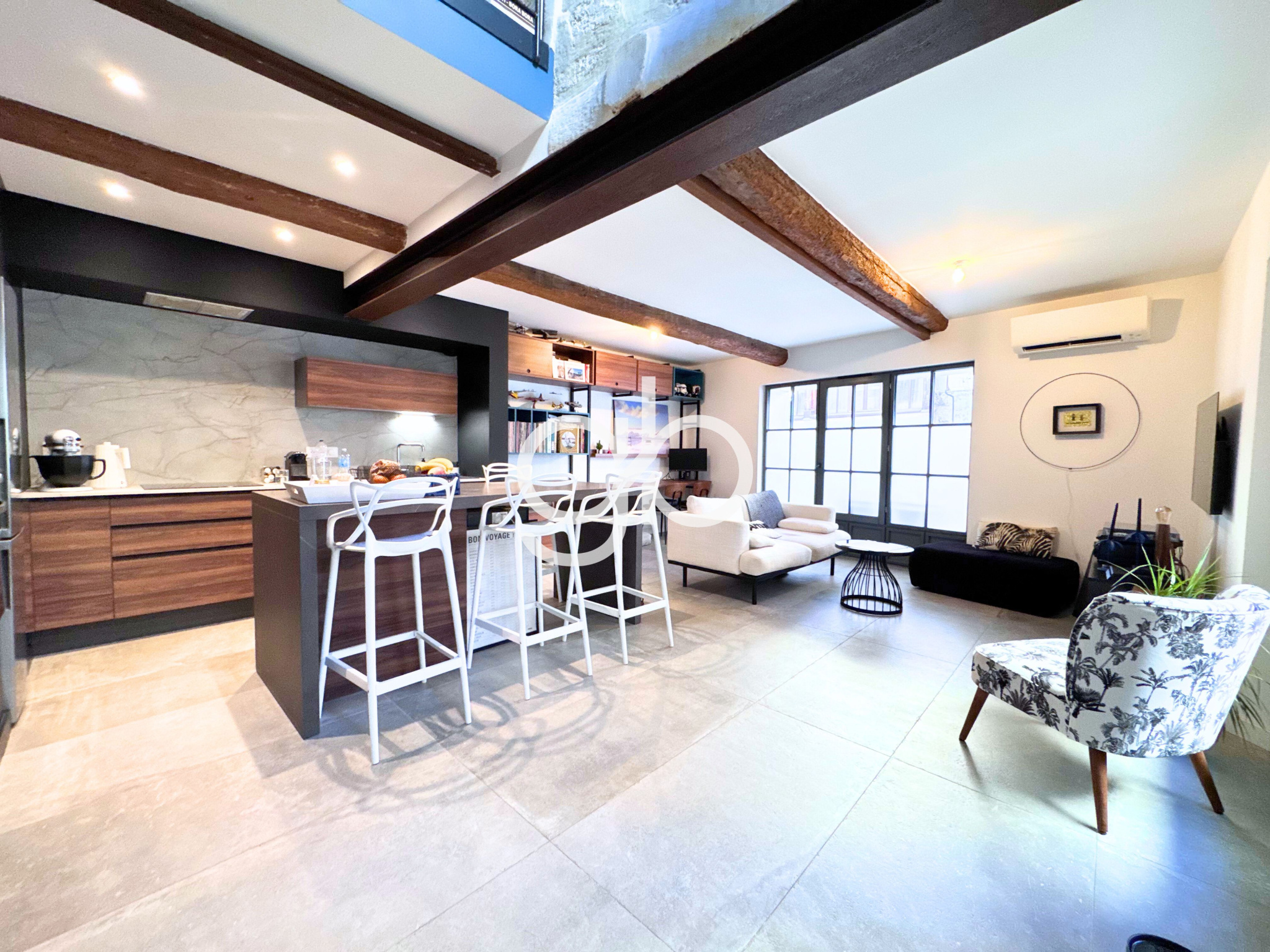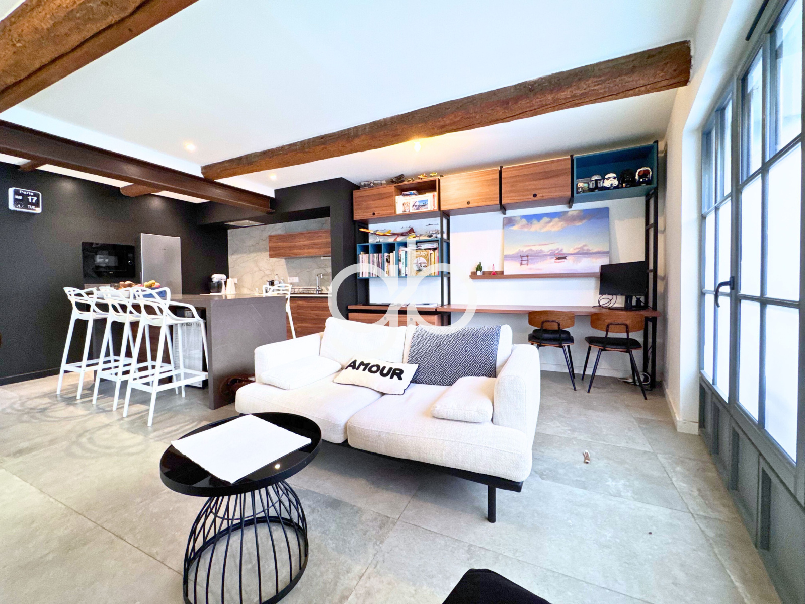 Dès l’entrée, la pièce de vie s’impose par sa luminosité naturelle, où le style industriel affirme une identité forte. La cuisine sur mesure s'intègre parfaitement au salon, créant un espace de réception qui se prolonge vers un bureau dédié au télétravail.