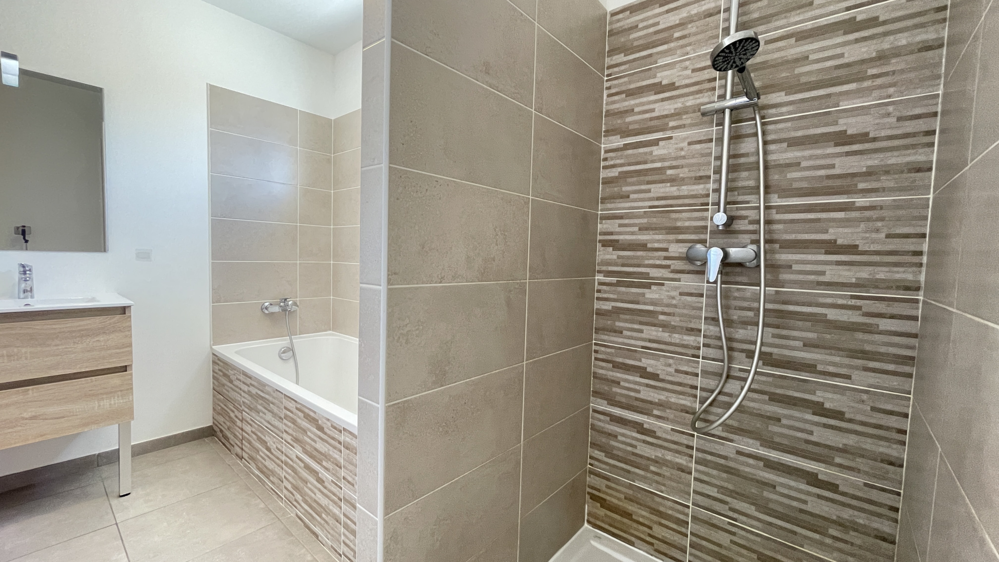 Salle de bain complète avec douche et baignoire