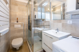 Une salle d'eau avec douche, vasque et wc est présente avec un espace pour une machine à laver.