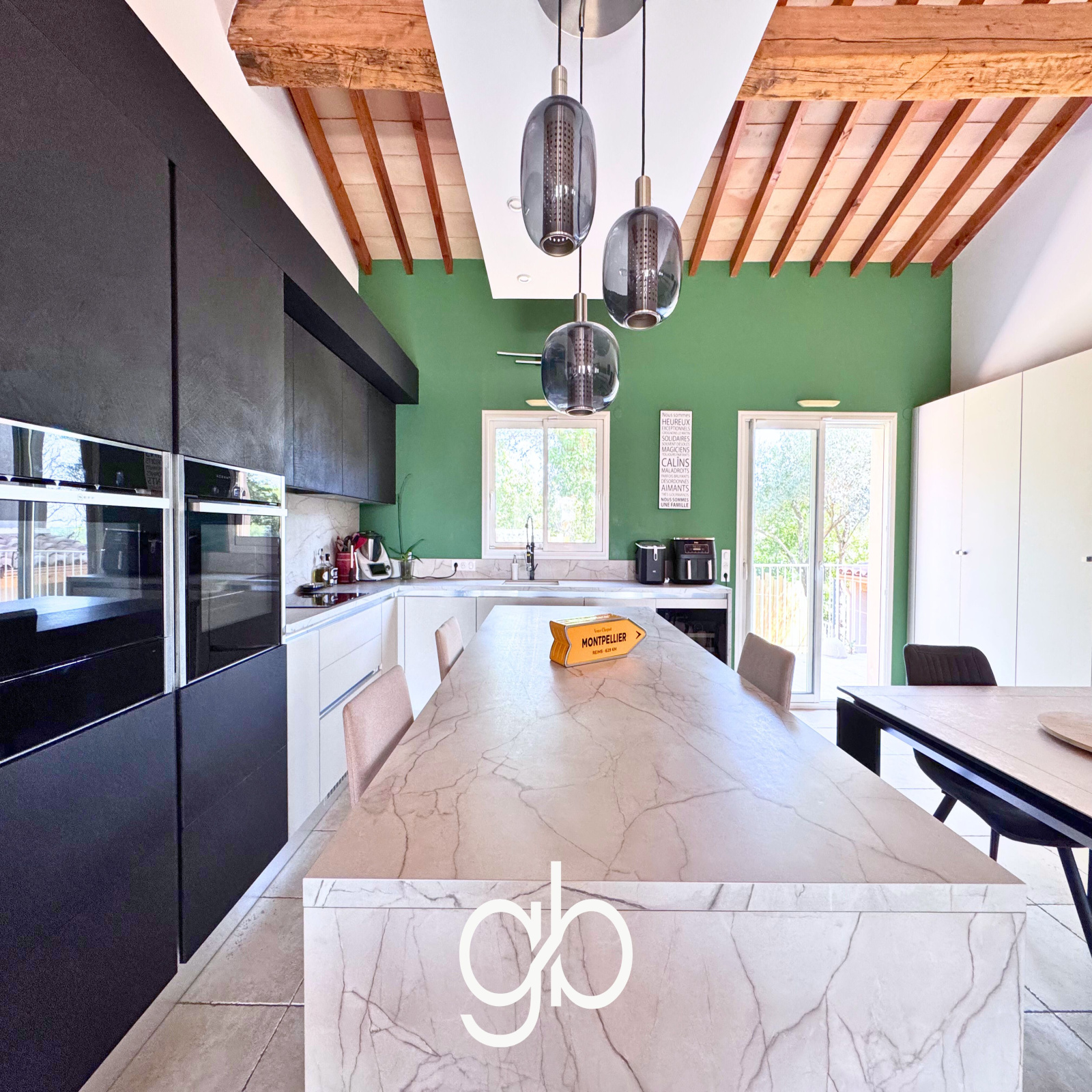 La cuisine ouverte s’articule autour d’un îlot central qui devient un point de rencontre naturel au quotidien, entre préparation des repas, échanges et moments de vie.