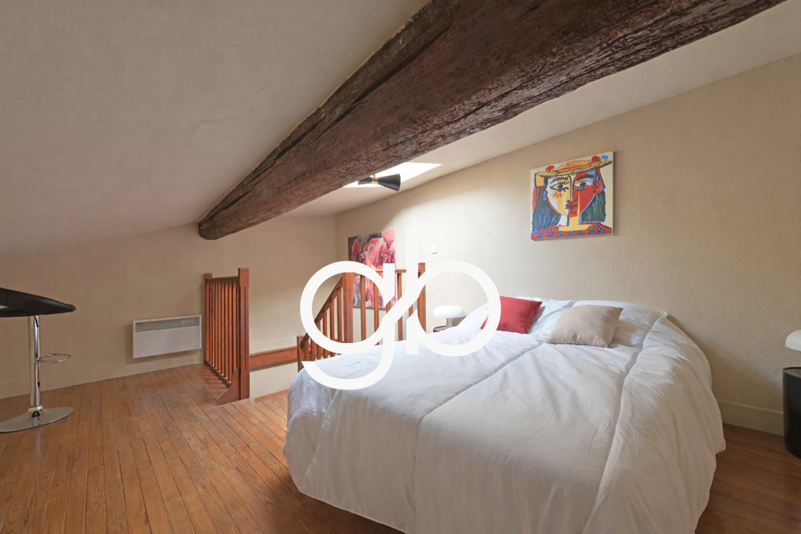 À l'étage : Une deuxième chambre mansardée (10 m² au sol), idéale pour un espace nuit cosy, une chambre d'amis ou un bureau pour le télétravail.