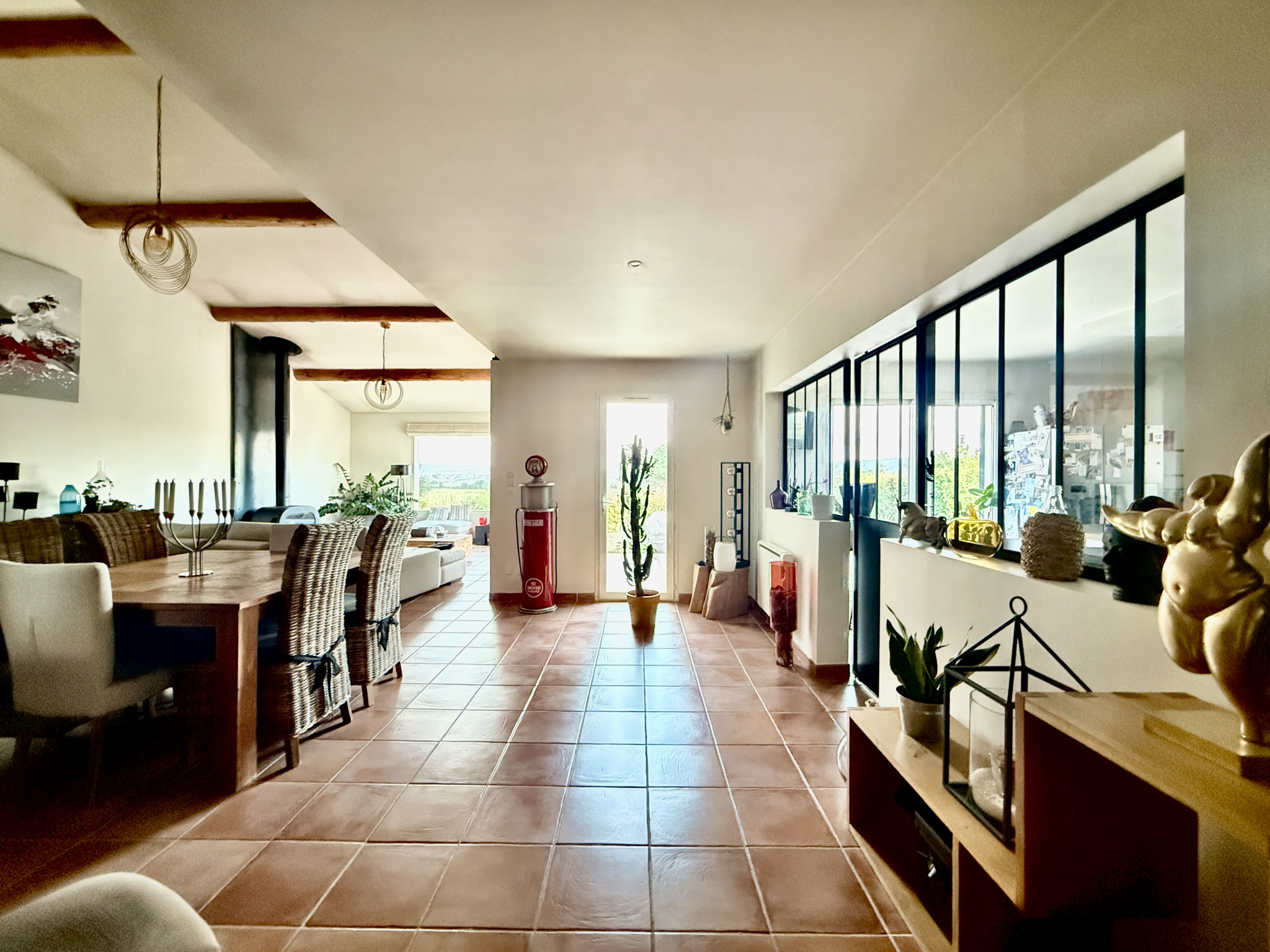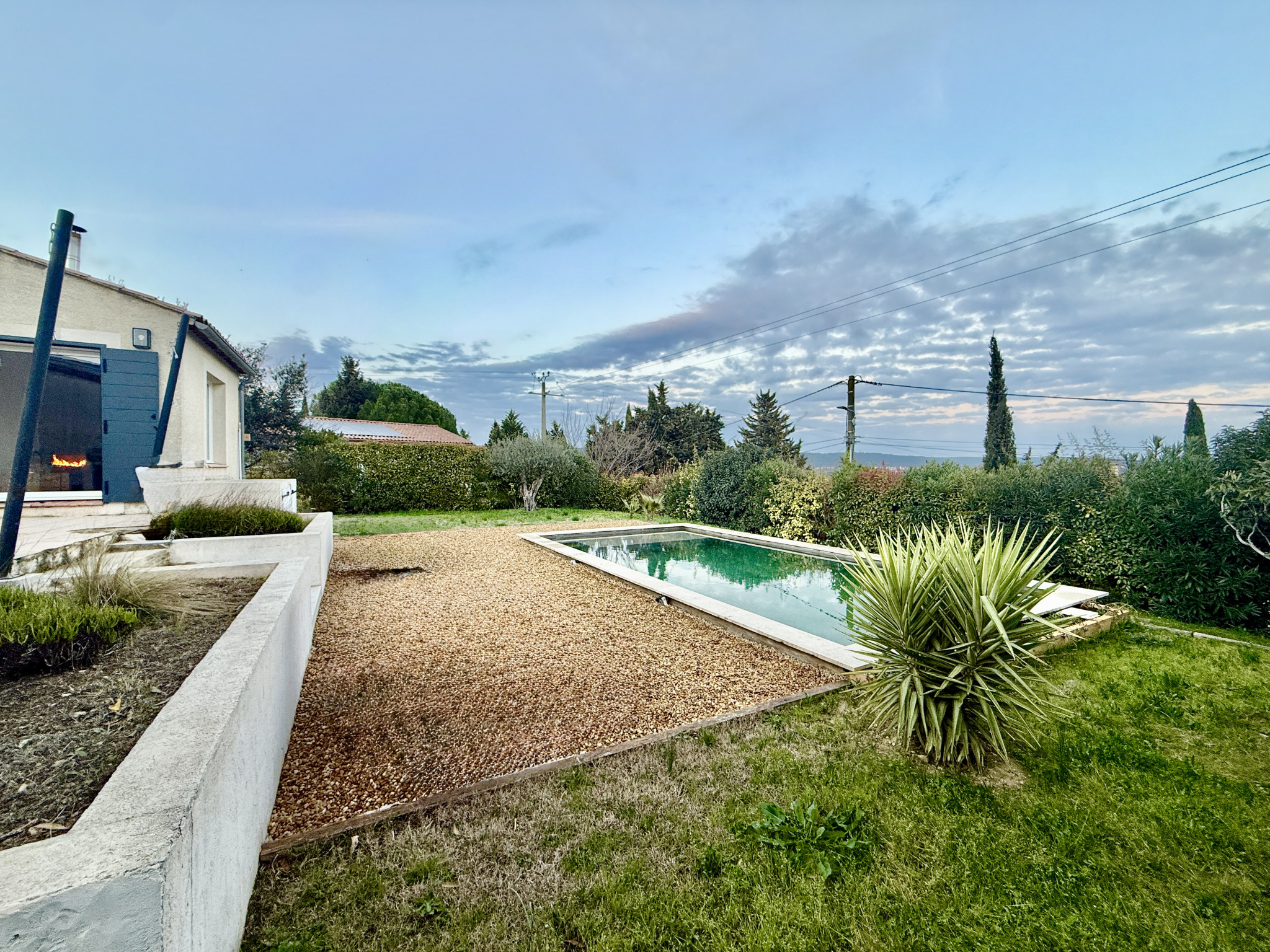 Maison plain-pied Calvisson, villa terrain 1100m², maison 4 chambres Vaunage, piscine sans vis-à-vis, vue Vaunage, maison de caractère Gard, suite parentale, rénovation 2019, poêle à bois