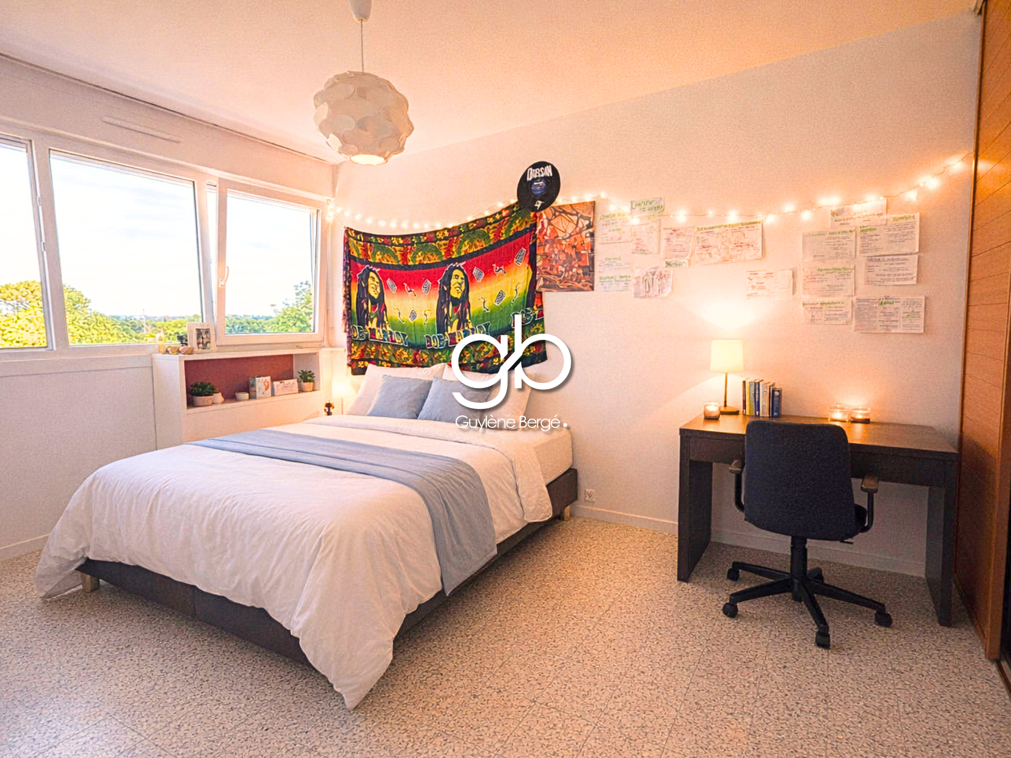 L'agencement intérieur a été optimisé pour la vie en communauté. Il se compose de quatre chambres meublées avec lits doubles, offrant chacune un espace privé confortable. La pièce de vie commune comprend un séjour ouvert sur une cuisine américaine entièrement équipée, favorisant la convivialité. Les prestations techniques sont au rendez-vous : menuiseries en double vitrage PVC, volets roulants et radiateurs neufs. L'appartement est entièrement raccordé à la fibre optique.