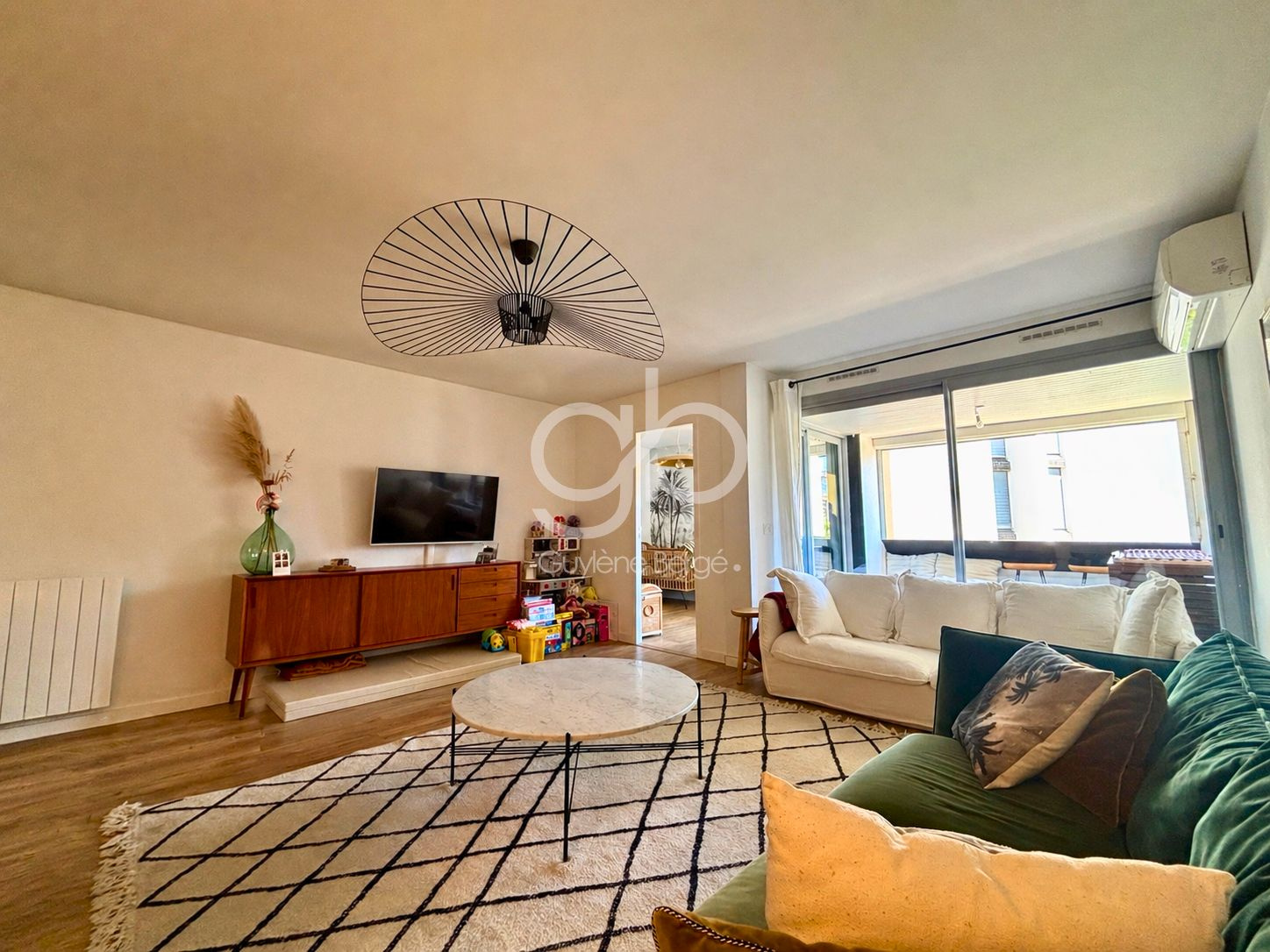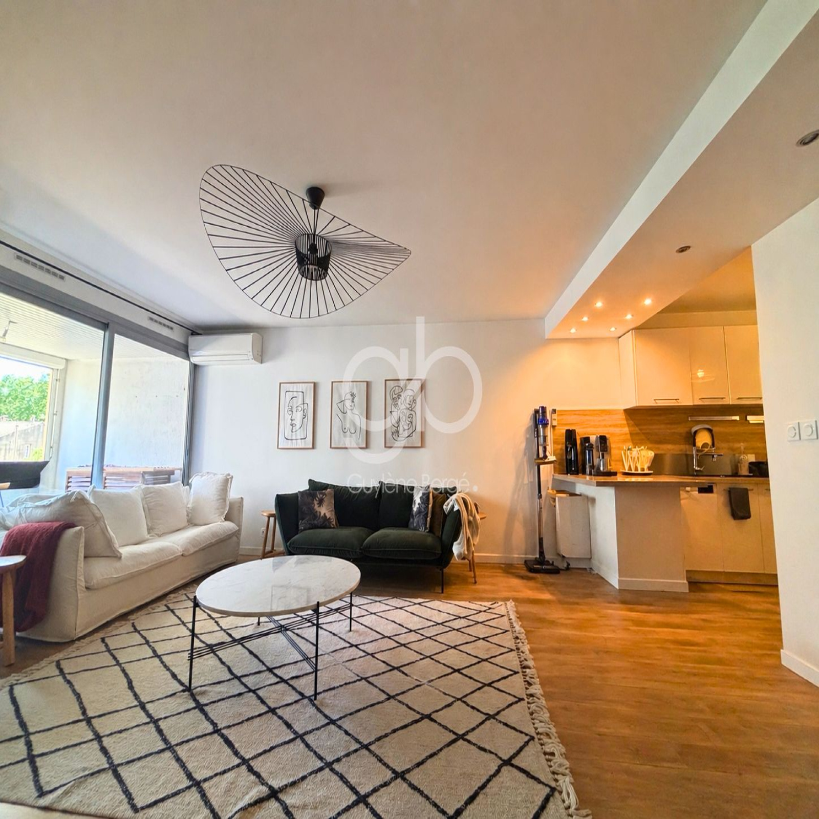 La pièce de vie, conviviale intègre une cuisine américaine entièrement équipée. Cet espace est prolongé par un second balcon accessible depuis la cuisine, idéal pour profiter d’un extérieur au quotidien. L’appartement est également équipé de la climatisation, garantissant un confort optimal en toute saison.
