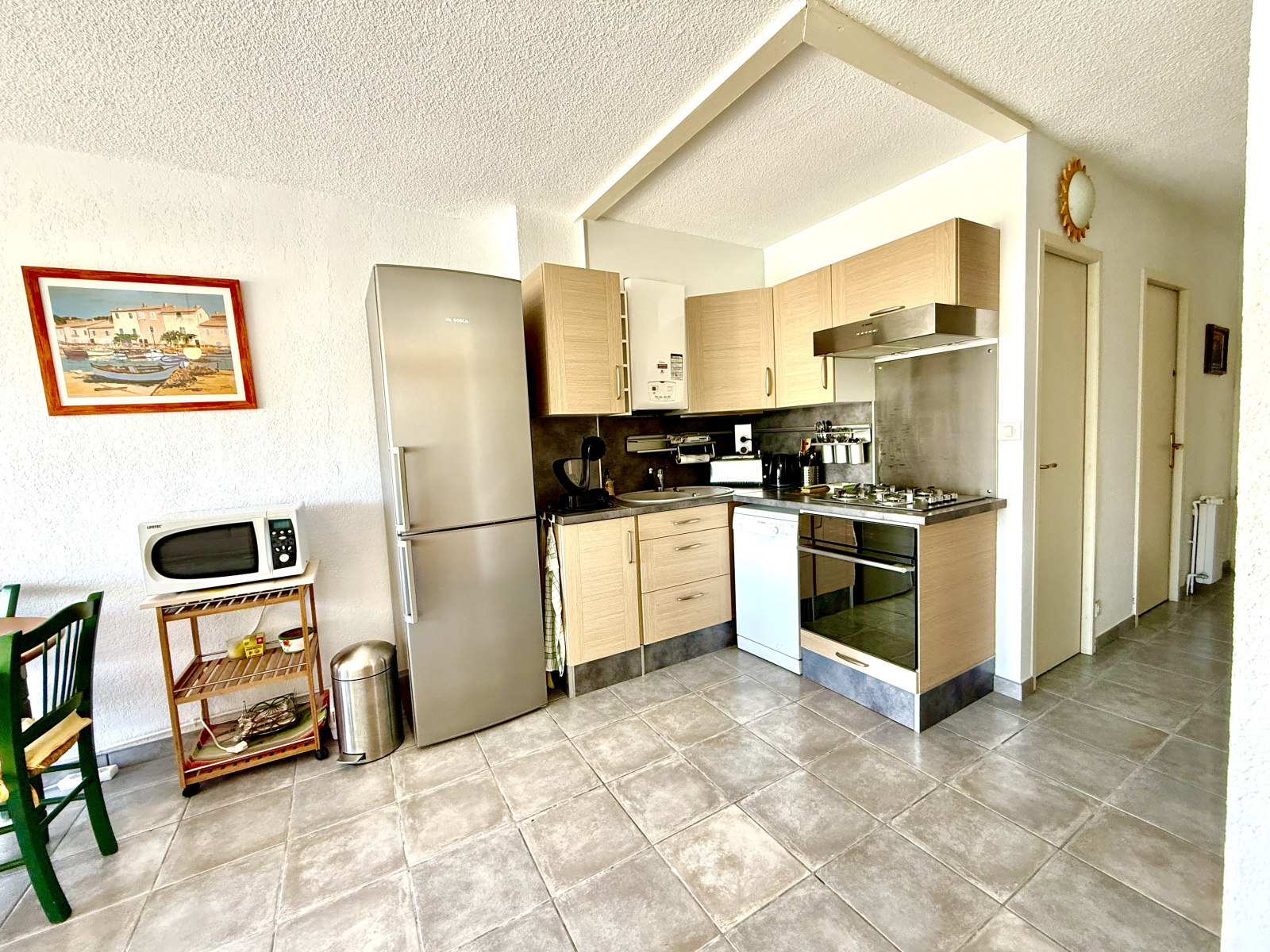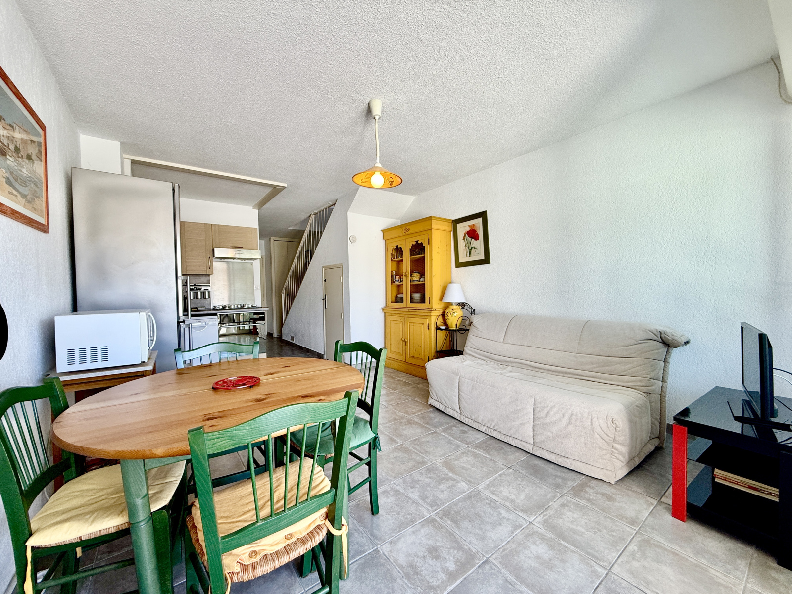 L’intérieur propose au rez-de-chaussée une chambre cabine, une cuisine ouverte sur un séjour lumineux donnant sur une terrasse conviviale en bord d’eau, ainsi qu’un WC.