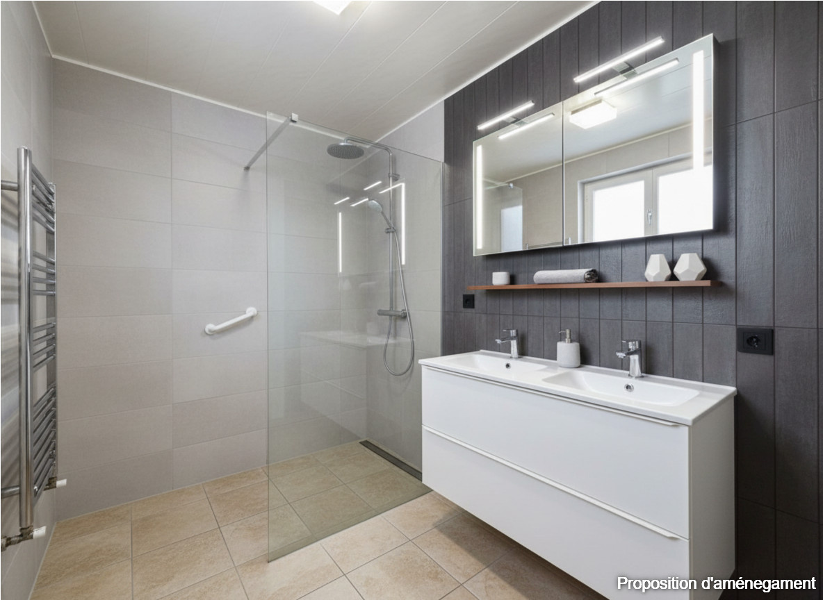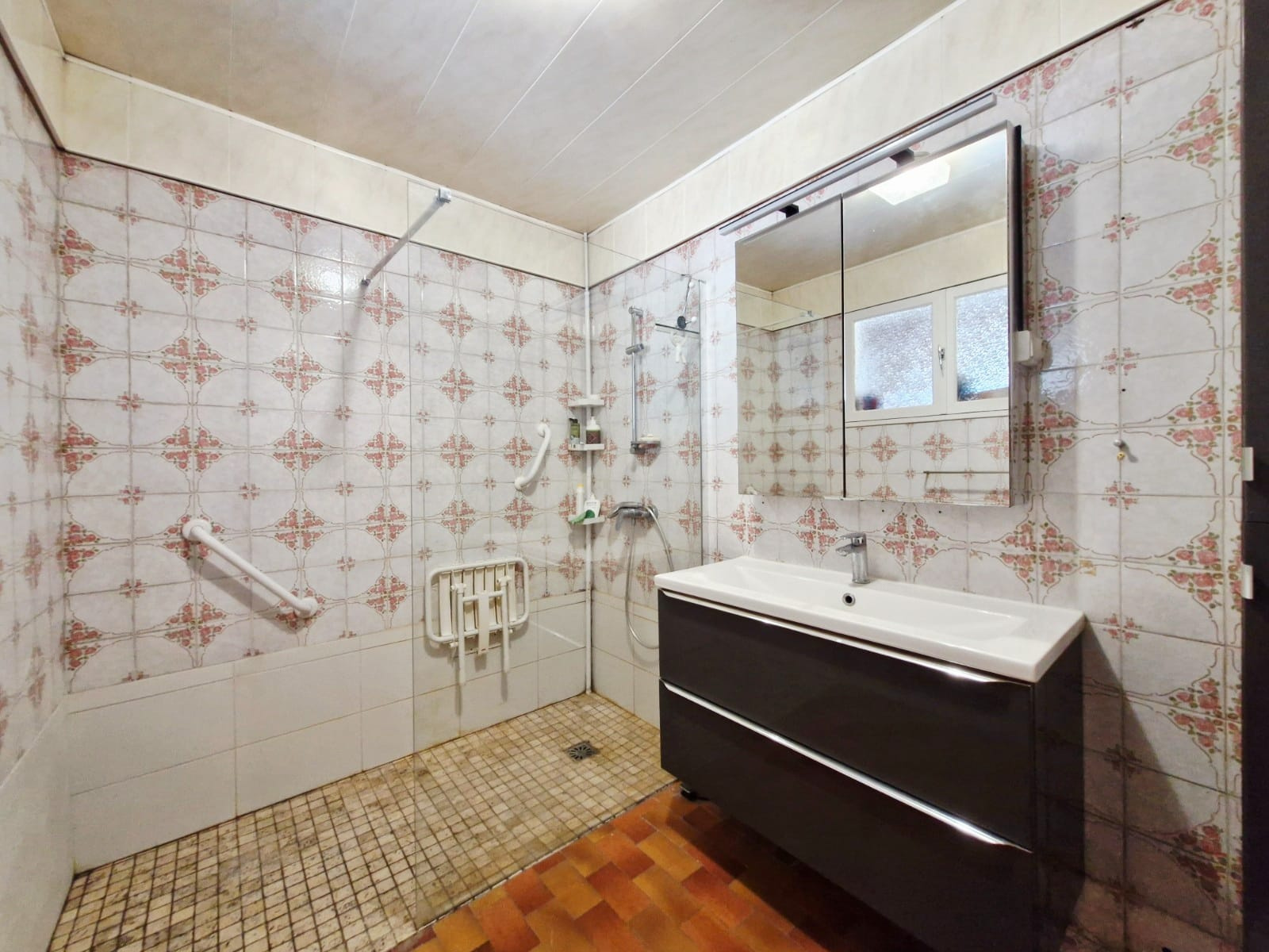 La salle de bains, à rafraichir, est équipée d'une grande vasque et d'une douche à l'italienne.