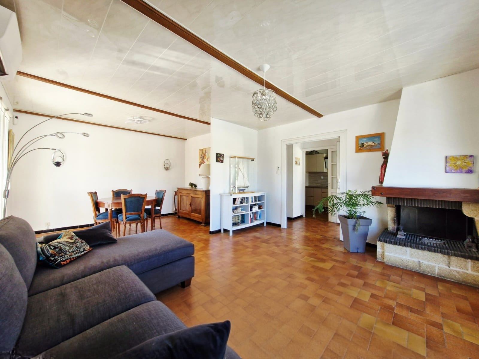 La visite de cette maison de plain pied, commence par une pièce de vie lumineuse de 26m2 ainsi qu'une cuisine de 10m2 moderne et équipée.